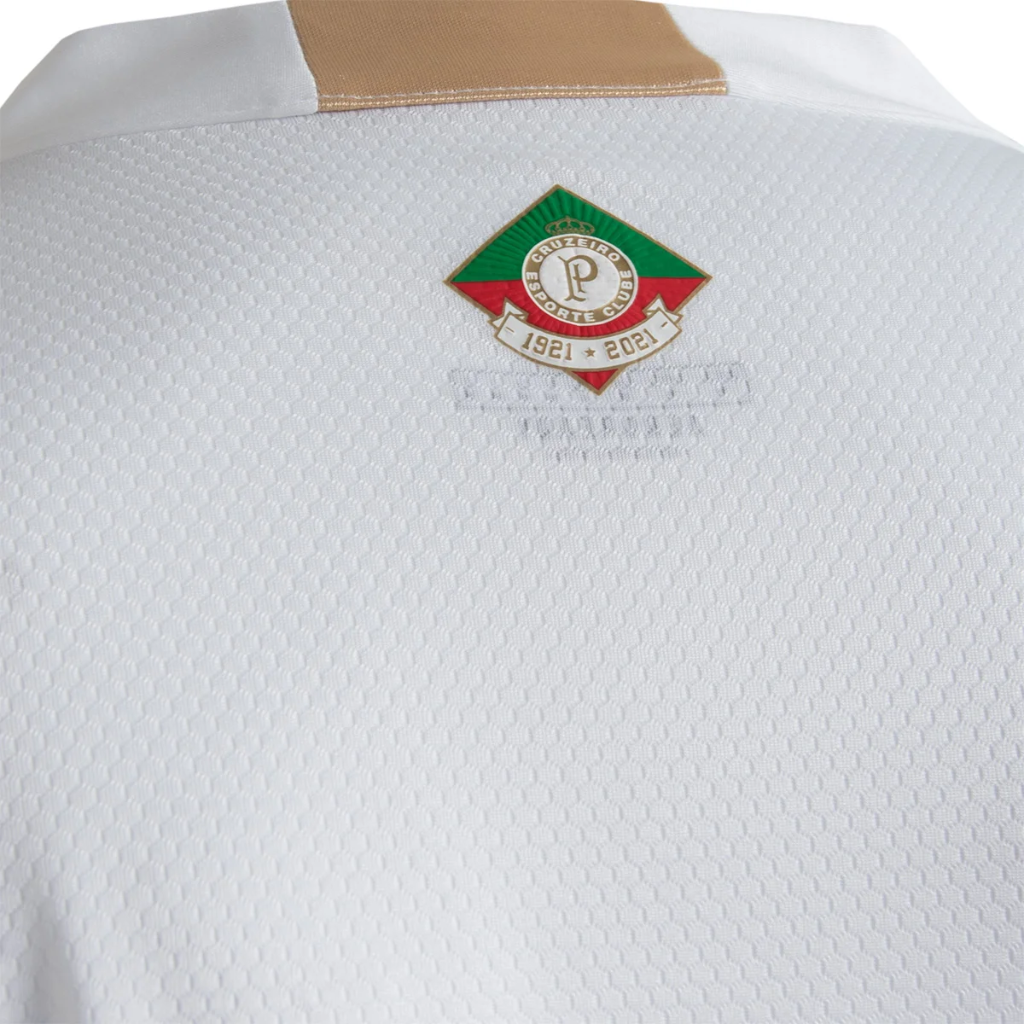 O dourado é utilizado como segunda cor, aparecendo nas três listras, dispostas nos ombros, e na nuca, onde também é colocado o escudo do Palestra Itália, primeiro do clube, com os anos de fundação (1921) e de centenário (2021).